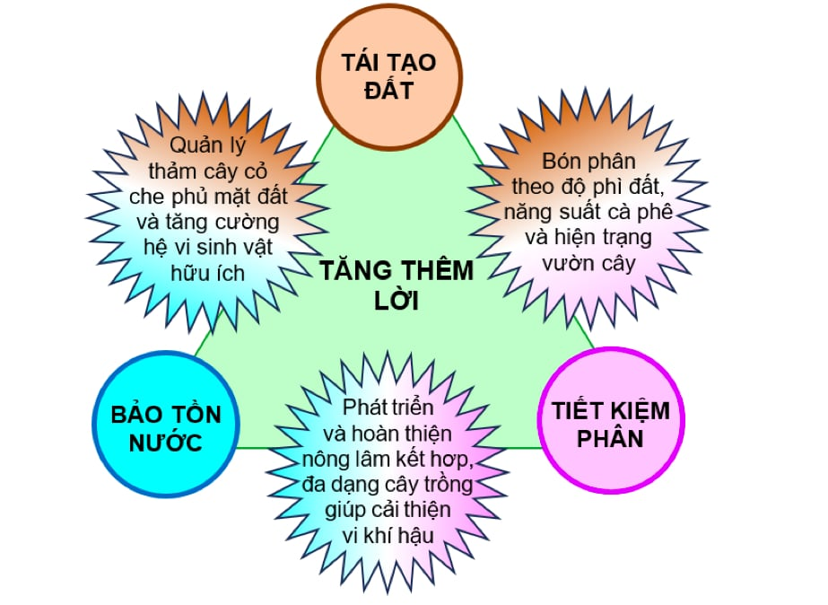 Quy trình canh tác cà phê thông minh tích hợp nhiều tiến bộ kỹ thuật cốt lõi và đồng bộ, áp dụng linh hoạt theo hiện trạng vườn để hiệu quả cao đối với cà phê và cả cây trồng xen.